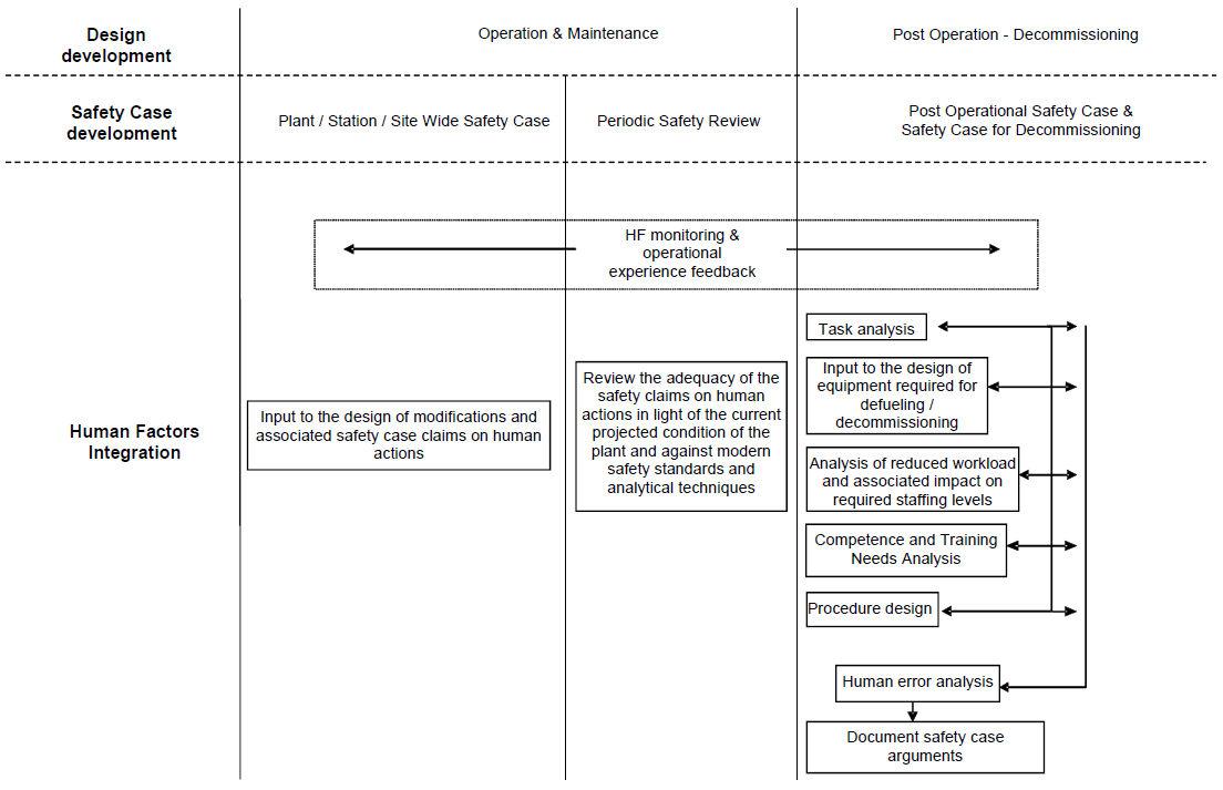 “A nuclear facility is a complex socio-technological system that comprises both engineered and human components. The human contribution to safety can be positive or negative, and may be made during facility design, construction, commissioning, operation, maintenance or decommissioning. A systematic approach to understanding the factors that affect human performance, and minimising the potential for human error to contribute to or escalate faults, therefore needs to be applied throughout the entire facility lifecycle. Assessments of the way in which individual, team and organisational performance can impact upon safety should influence the design of the facility, plant, equipment and administrative controls including emergency arrangements. The allocation of safety actions to human or engineered components should take account of their differing capabilities and limitations. Safety cases need to demonstrate that interactions between human and engineered components are fully understood, and that human actions that might impact on safety are clearly identified and adequately supported.”